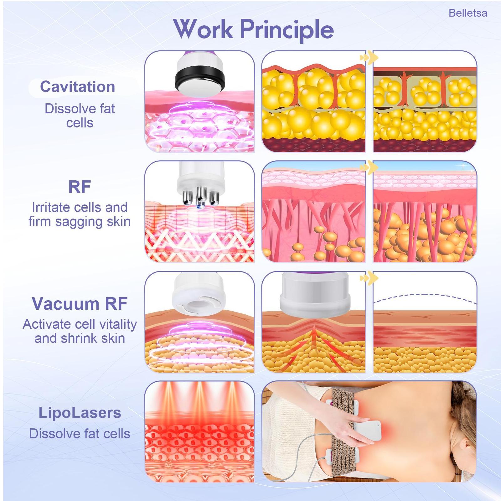 Συνδυάζει τεχνολογίες RF (Radio Frequency), Cavitation 40kHz, Vacuum και Laser Pads, προσφέροντας ολοκληρωμένη φροντίδα αισθητικής σε μία μόνο συσκευή.