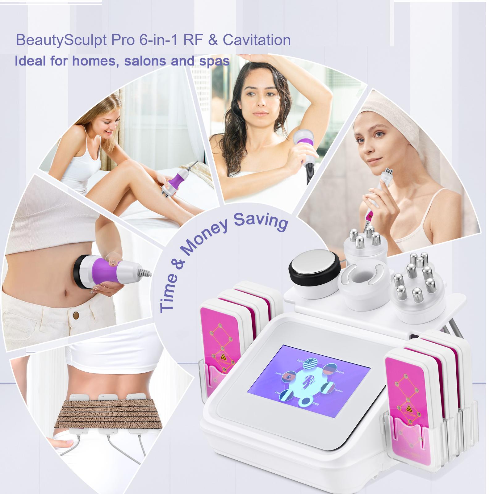 BeautySculpt Pro 6-in-1 RF & Cavitation Πολυμηχάνημα Αισθητικής είναι ένα πολυλειτουργικό σύστημα ομορφιάς σχεδιασμένο για σύσφιξη δέρματος, περιποίηση προσώπου και διαμόρφωση σώματος.